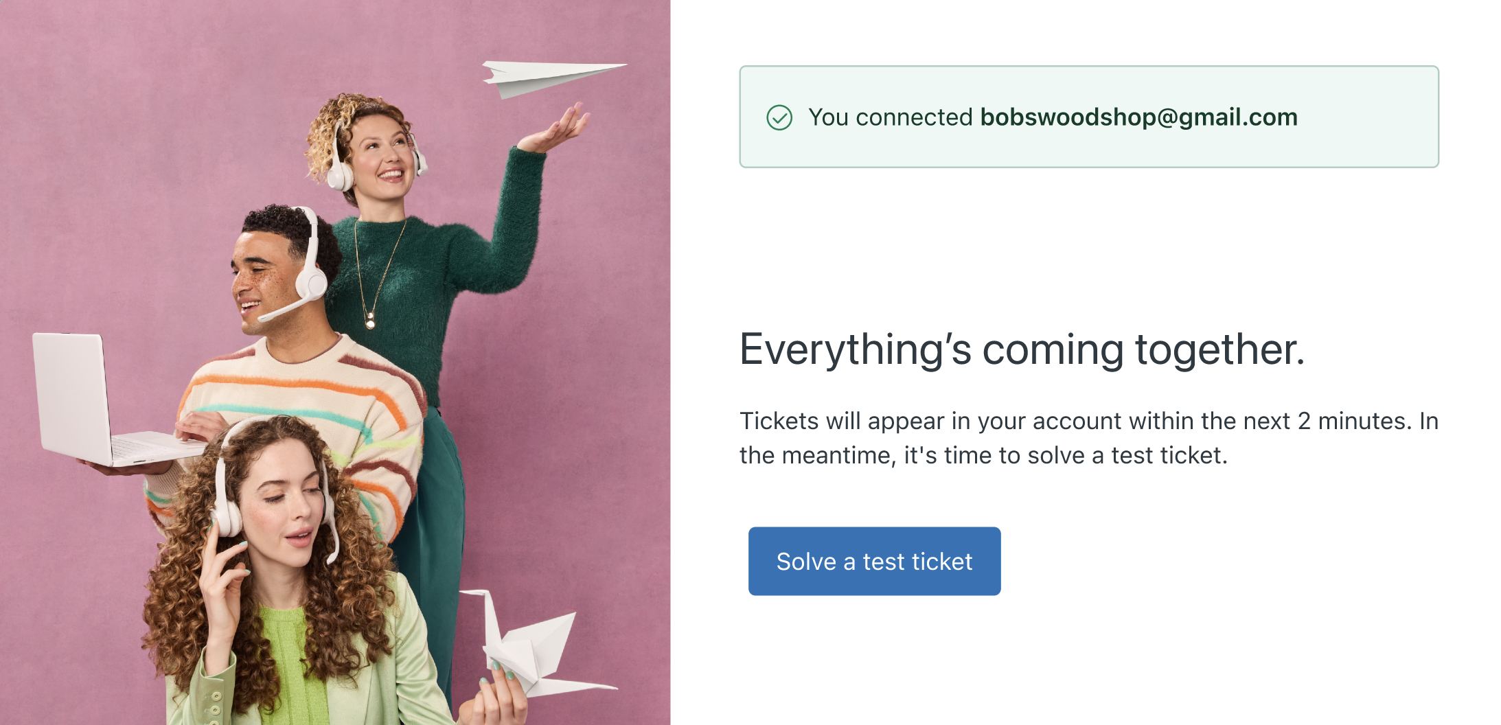 When you’re done connecting email, you’ll see an invitation to solve a test ticket.